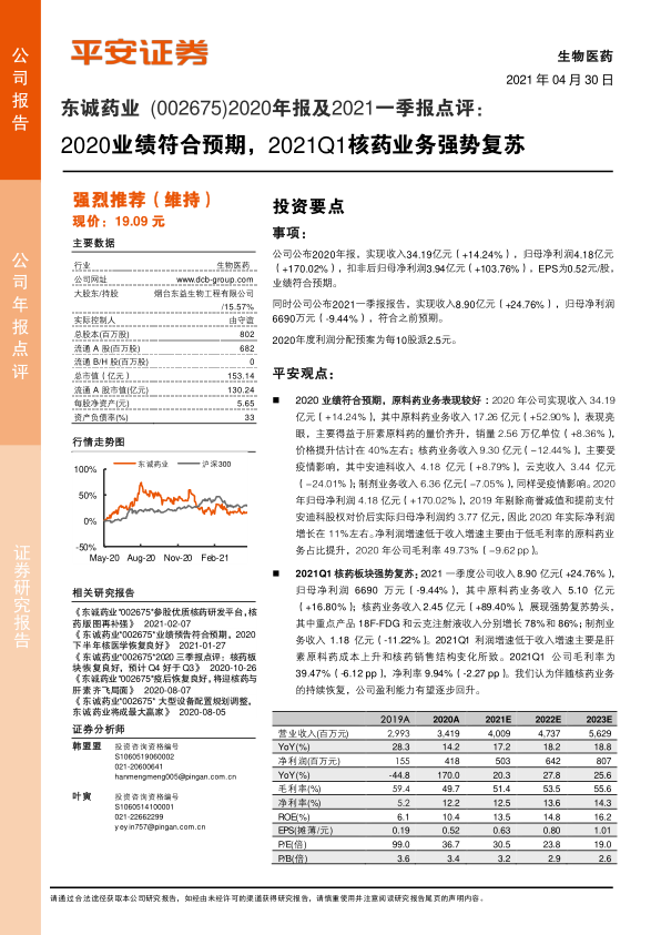本报告分析了东诚药业2020年业绩符合预期,原料药业务表现较好,2021Q1核药板块强势复苏,公司打造完整核药生态圈,未来发展空间广阔。但同时也提示了原料药波动、核医学市场放量速度以及研发等风险。维持“强烈推荐”评级。
