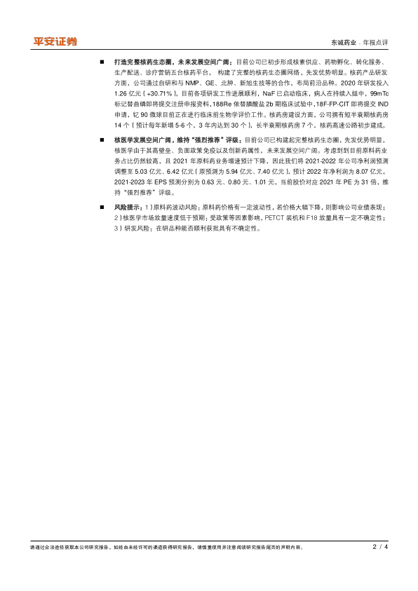 风险提示:1)原料药波动风险:原料药价格有一定波动性,若价格大幅下降,则影响公司业绩表现;2)核医学市场放量速度低于预期:受政策等因素影响,PETCT装机和F18放量具有一定不确定性;3)研发风险:在研品种能否顺利获批具有不确定性。