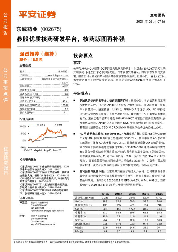 本报告分析了东诚药业参股APRINOIA的事件,认为此举将有效扩张公司在核药领域的布局,并强调了APRINOIA的核心产品18F-APN-1607在阿尔兹海默病诊断方面的市场潜力。报告维持了对东诚药业的“强烈推荐”评级,并提示了相关风险。