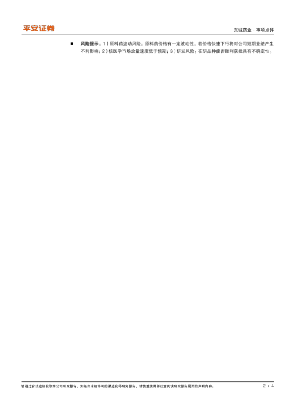 风险提示:1)原料药波动风险:原料药价格有一定波动性,若价格快速下行将对公司短期业绩产生不利影响;2)核医学市场放量速度低于预期;3)研发风险:在研品种能否顺利获批具有不确定性。