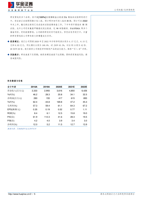 投资建议:我们公司预测2020年至2022年归母净利润分别为4.17亿元、6.15亿元和8.93亿元,同比增长分别为169.8%、47.2%和45.3%;对应PE分别为42倍、28倍和20倍。我们看好公司核医学和制剂产品的成长能力,维持“买入-B”评级。