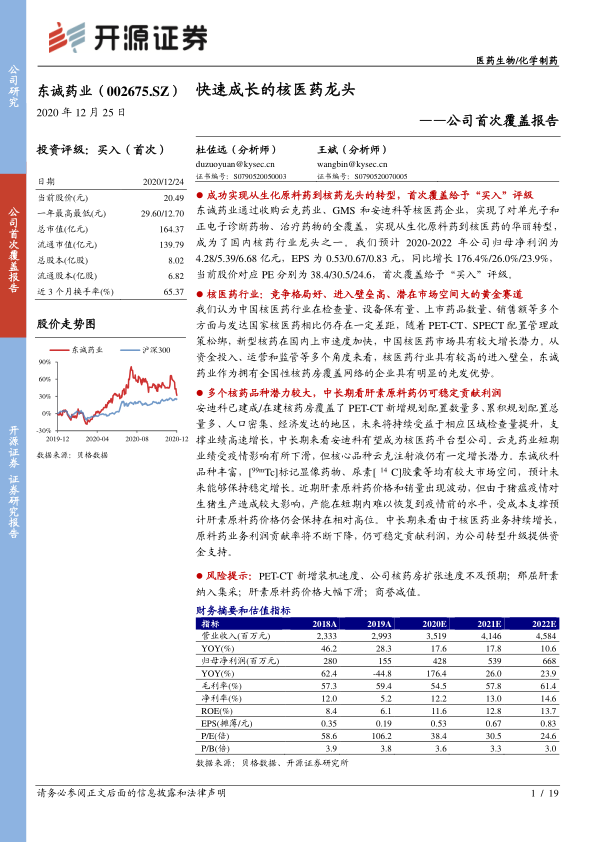 东诚药业通过收购云克药业、GMS和安迪科等核医药企业,实现了对单光子和正电子诊断药物、治疗药物的全覆盖,实现从生化原料药到核医药的华丽转型,成为了国内核药行业龙头之一。我们预计2020-2022年公司归母净利润为4.28/5.39/6.68亿元,EPS为0.53/0.67/0.83元,同比增长176.4%/26.0%/23.9%,当前股价对应PE分别为38.4/30.5/24.6,首次覆盖给予“买入”评级。