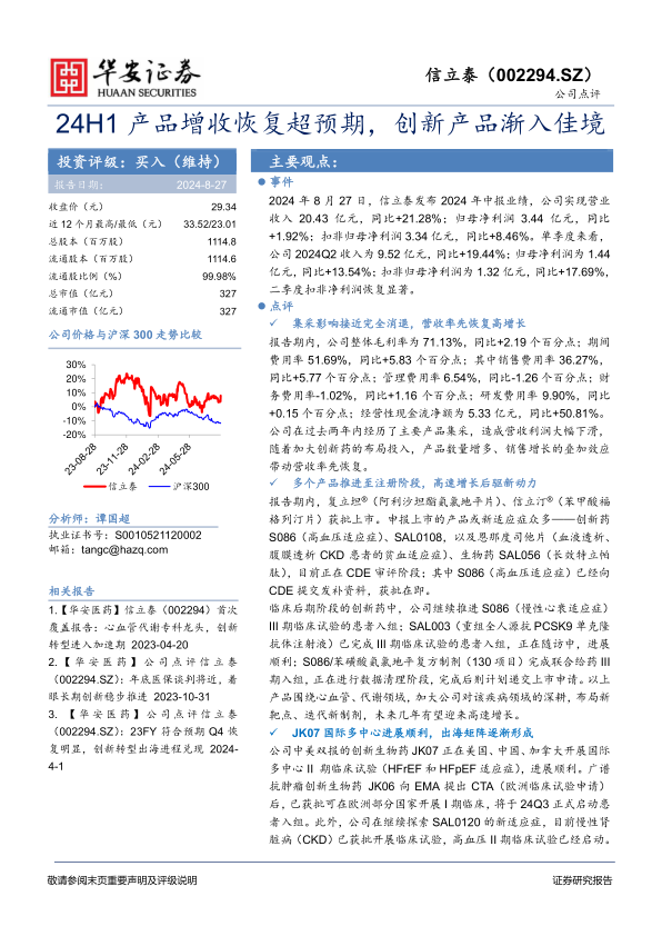本报告分析了信立泰2024年中报业绩,并维持“买入”评级。