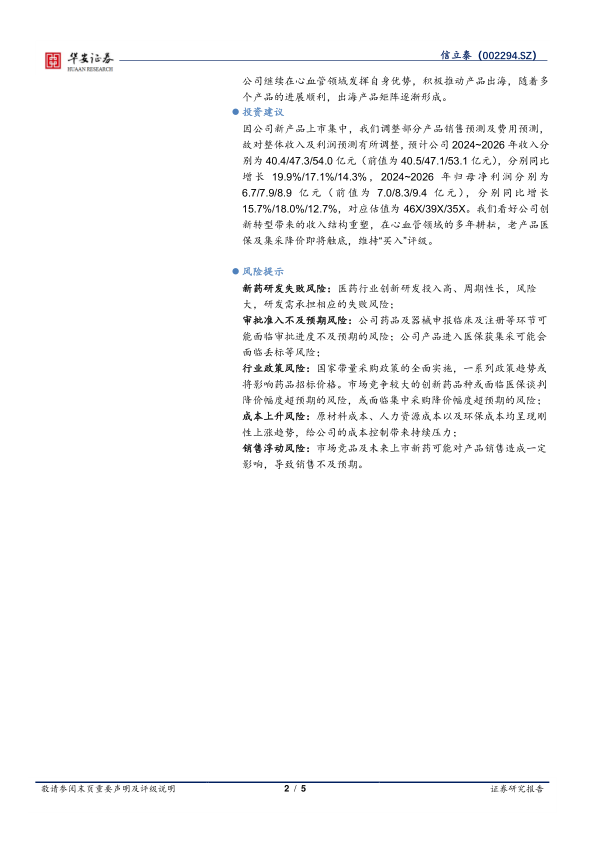 因公司新产品上市集中,我们调整部分产品销售预测及费用预测,故对整体收入及利润预测有所调整,预计公司2024~2026年收入分别为40.4/47.3/54.0亿元(前值为40.5/47.1/53.1亿元),分别同比增长19.9%/17.1%/14.3%,2024~2026年归母净利润分别为6.7/7.9/8.9亿元(前值为7.0/8.3/9.4亿元),分别同比增长15.7%/18.0%/12.7%,对应估值为46X/39X/35X。我们看好公司创新转型带来的收入结构重塑,在心血管领域的多年耕耘,老产品医保及集采降价即将触底,维持“买入”评级。