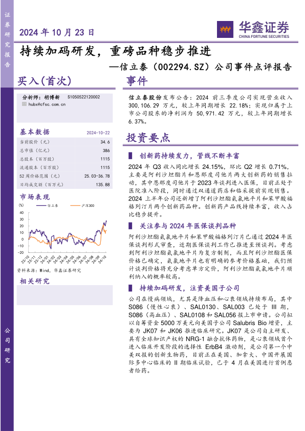 本报告对信立泰(002294.SZ)进行了公司事件点评,核心观点是信立泰通过持续加码研发,创新药产品线不断丰富,业绩增长主要由创新药驱动。公司在慢病领域,尤其是降血压和心衰领域持续布局,多个创新药项目进入临床后期,并注资美国子公司加速创新生物药的研发。预计公司未来收入和利润将保持增长,首次覆盖,给予“买入”投资评级。同时,报告也提示了医保谈判价格波动、销售不及预期及研发进展不及预期等风险。