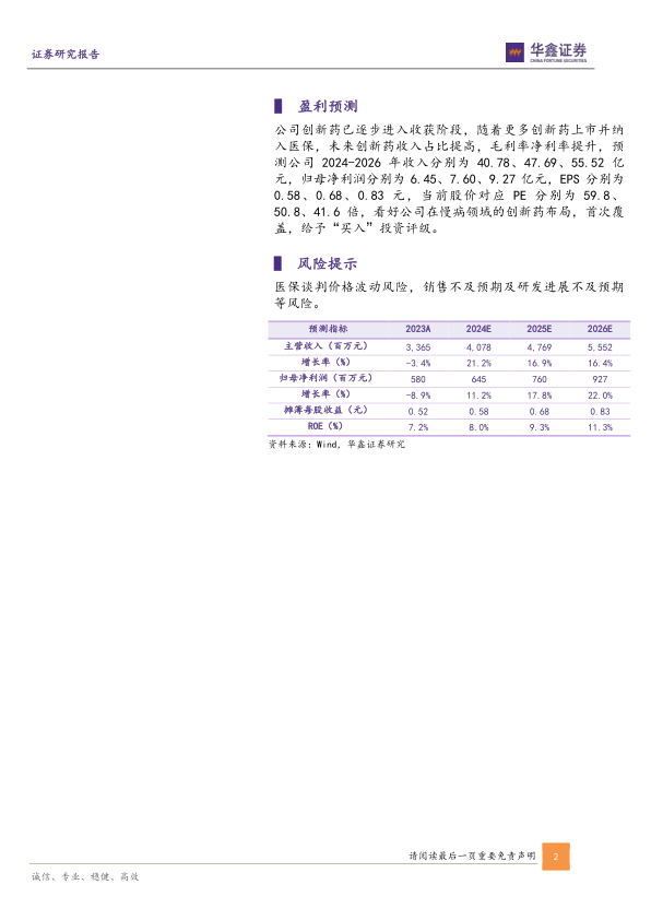 公司创新药已逐步进入收获阶段,随着更多创新药上市并纳入医保,未来创新药收入占比提高,毛利率净利率提升,预测公司2024-2026年收入分别为40.78、47.69、55.52亿元,归母净利润分别为6.45、7.60、9.27亿元,EPS分别为0.58、0.68、0.83元,当前股价对应PE分别为59.8、50.8、41.6倍,看好公司在慢病领域的创新药布局,首次覆盖,给予“买入”投资评级。