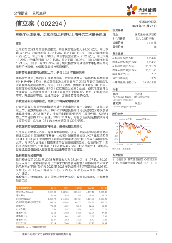 报告强调了信立泰通过创新药物研发,特别是在心血管、降糖减重等领域的布局,为公司长期发展提供动力。维持“买入”评级,但考虑到创新药上市带来的销售费用增长和仿制药集采带来的毛利率下降,下调了2023至2025年的归母净利润预测值。