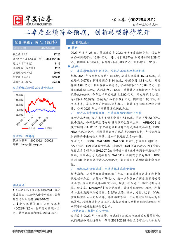信立泰2023年中报显示业绩符合预期,集采影响逐步消化,创新药和国际化是未来增长点。公司积极拓展销售渠道,应对集采降价。维持“买入”评级,但需关注新药研发、审批、政策、成本和销售等风险。