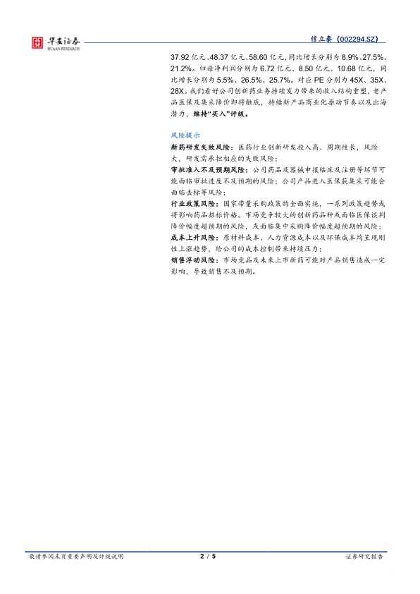 报告中提示了新药研发失败风险、审批准入不及预期风险、行业政策风险、成本上升风险和销售浮动风险。