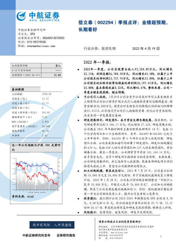 本报告由中航证券金融研究所的沈文文(CFA)撰写,对信立泰(002294)2022年一季度的业绩进行了点评,并给出了投资建议。