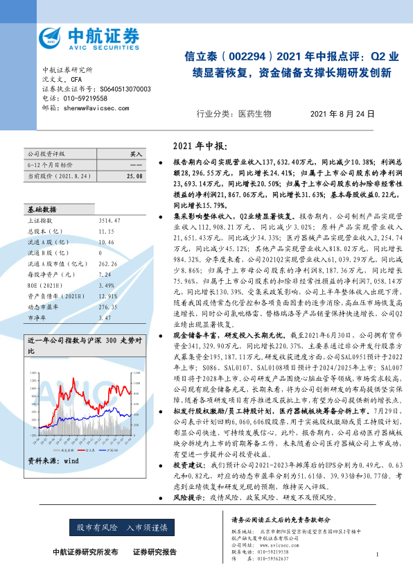 2021年中报点评:Q2业绩显著恢复,资金储备支撑长期研发创新