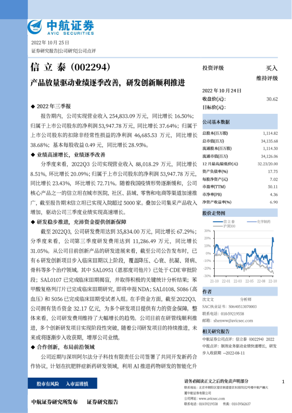 分季度来看,2022Q3公司实现营业收人888.018.29万元,同比增长8.51%,环比增长20.09%;归属于上市公司股东的净利润53.947.78万元可比增长23.43%,环比增长72.71%。随着我国疫情形势逐渐缓和,公司核心产品之一的信立坦在城市医院、社区、县域、零售和电商等渠道加速推广,截至报告期末信立坦已实现入院超过5000家。叠加公司集采产品收入增加,驱动公司三季度业绩实现高速增长。