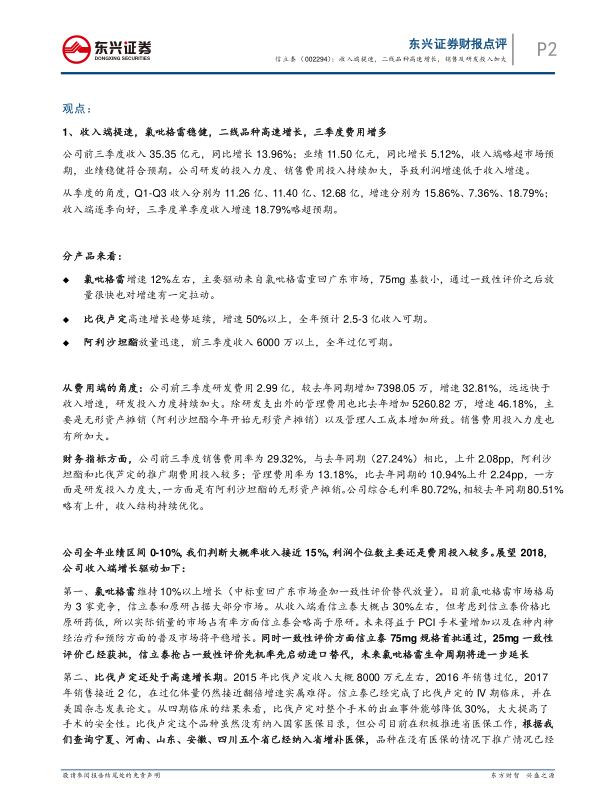 本报告的核心观点是信立泰收入端提速,二线品种高速增长,同时销售及研发投入加大。