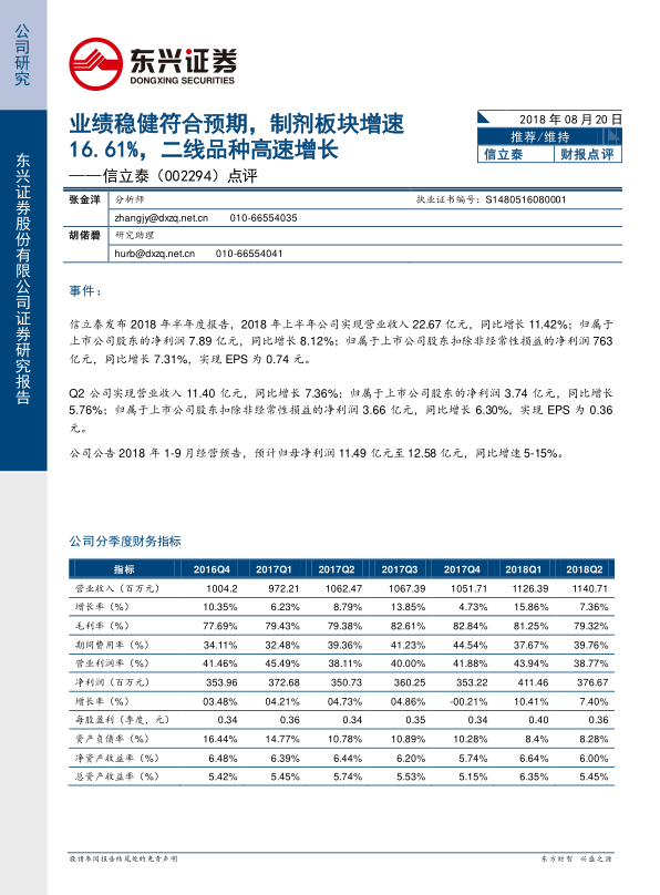 点评:业绩稳健符合预期,制剂板块增速16.61%,二线品种高速增长
