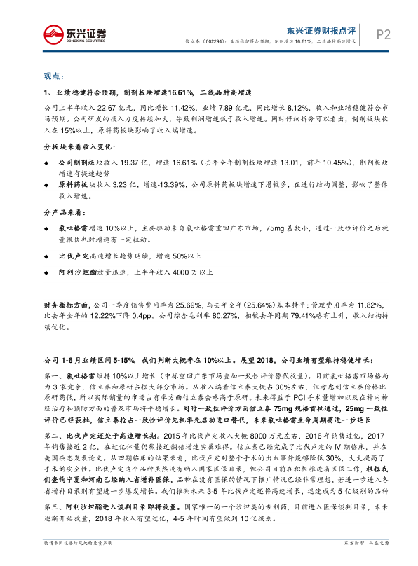 信立泰业绩稳健,符合预期,制剂板块增速显著。氯吡格雷通过一致性评价,生命周期有望延长,比伐卢定、阿利沙坦酯等品种高速增长,为公司发展提供强劲动力。