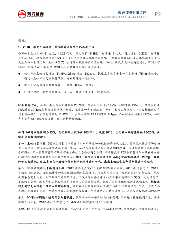 信立泰受益于氯吡格雷一致性评价带来的进口替代机会,以及比伐卢定、阿利沙坦酯等产品的快速增长,一季度业绩提速。