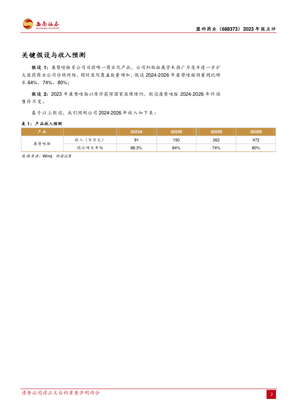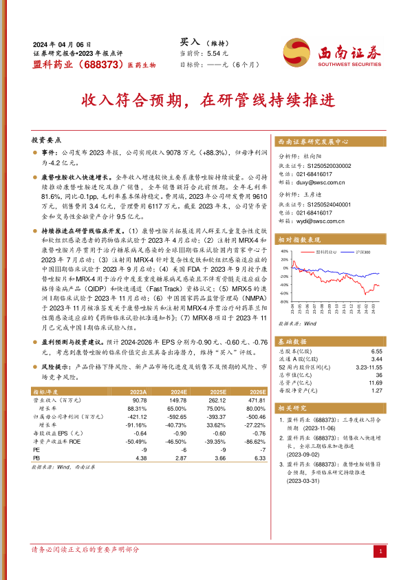 本报告分析了盟科药业2023年报,指出公司康替唑胺收入快速增长,在研管线持续推进。公司在2023年报中显示,全年收入增速较快主要系康替唑胺持续放量,全年销售额符合此前预期。公司持续推动康替唑胺进院及推广销售,全年毛利率基本保持稳定。同时,公司持续推进在研管线临床开发,多个项目取得重要进展。考虑到康替唑胺的临床价值和出海潜力,维持“买入”评级,但需关注产品价格下降、新产品市场化进度不及预期以及市场竞争等风险。
