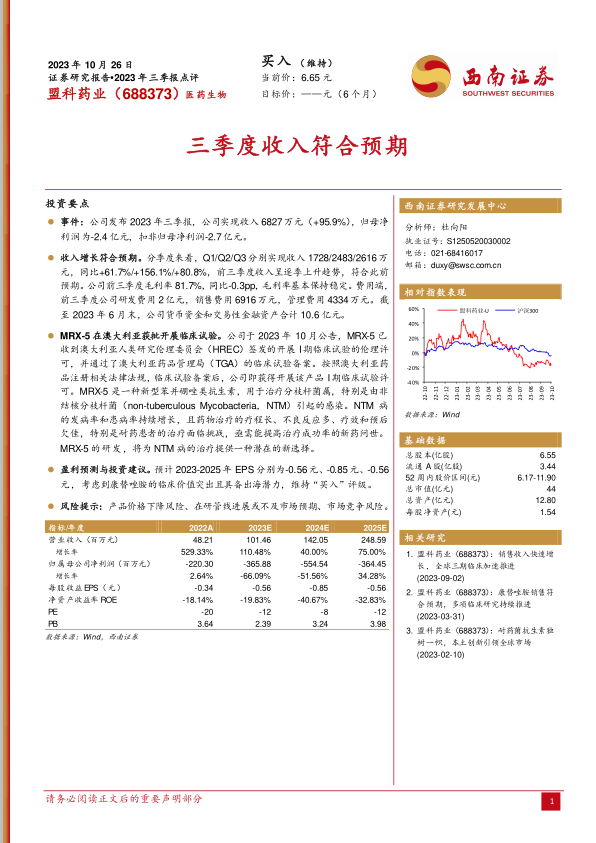 本报告分析了盟科药业2023年三季报,指出公司收入增长符合预期,MRX-5临床试验取得进展。考虑到康替唑胺的临床价值和出海潜力,维持“买入”评级。同时,报告也提示了产品价格下降、研发进展不及预期以及市场竞争等风险。