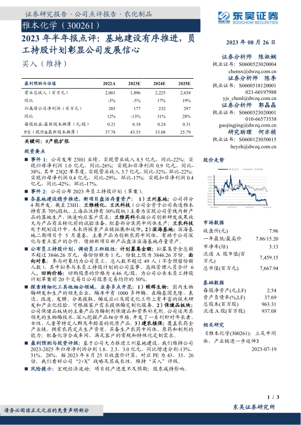 本报告分析了雅本化学2023年半年度业绩,指出公司营收和利润同比有所下降,但各基地建设稳步推进,员工持股计划彰显公司发展信心。