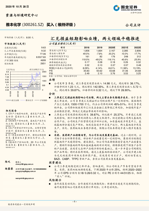 公司三季度短期受到汇率冲击,影响盈利,但公司的生产节奏有望逐步恢复,农药、医药双板块持续发展,下调2020年业绩 25%,预测 2020~2022 年 公司 EPS 分别为 0.18/ 0.26/0.32元,对应 PE分别为44/31/25倍,维持 “买入”评级。