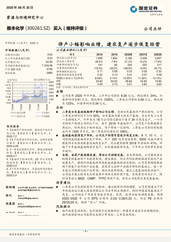 本报告核心观点指出,雅本化学在2020年第二季度因主要生产基地(如东基地)的短期停产整改,导致当期业绩环比出现下滑。然而,随着如东基地和盐城基地相继获得复产审批并逐步恢复生产,公司经营活动正回归正轨,预计下半年业绩将显著回升,最大限度地弥补上半年的停产影响,确保全年业绩的稳健增长。公司管理层通过高效的检修和复产安排,旨在将停产带来的负面效应降至最低,并利用下半年的生产高峰期实现业绩反弹。