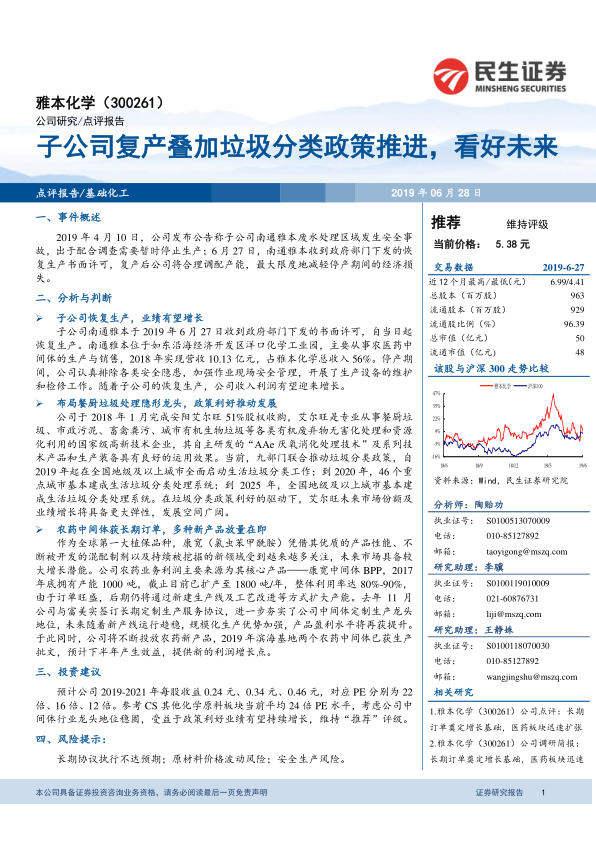 基于对公司子公司复产、垃圾分类政策利好以及农药中间体业务稳健增长的综合判断,报告对雅本化学的未来盈利能力持乐观态度。预计公司2019年至2021年的每股收益(EPS)将分别达到0.24元、0.34元和0.46元。按照当前股价计算,对应的市盈率(PE)分别为22倍、16倍和12倍。