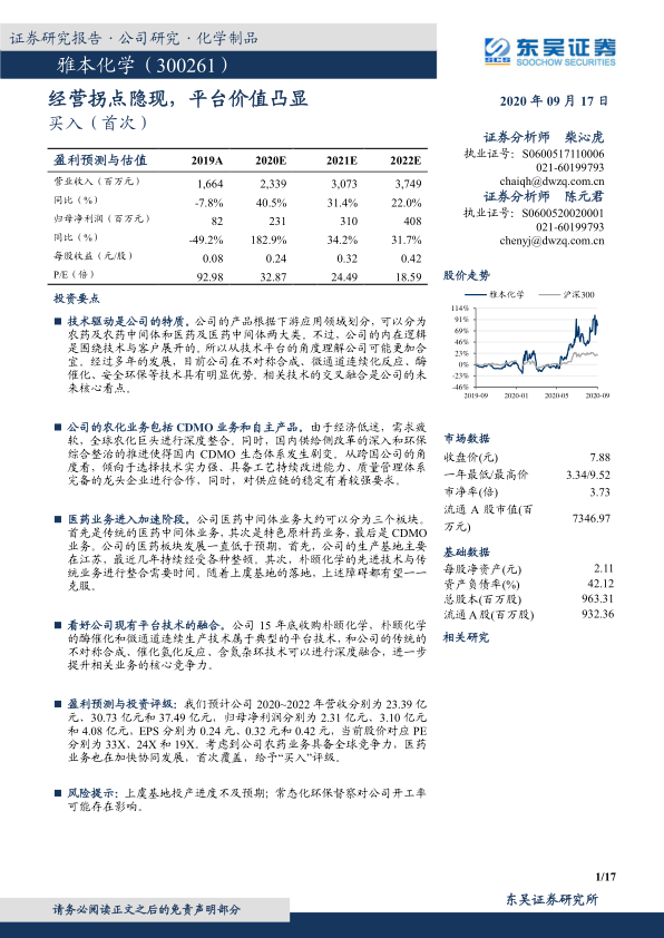 报告对雅本化学的未来业绩持乐观态度,预计2020-2022年营收和归母净利润将实现高速增长,并首次给予“买入”评级。这主要基于公司在农化业务的稳健增长、医药业务的加速发展以及技术融合带来的协同效应。然而,公司也面临上虞基地投产进度不及预期和常态化环保督察可能影响开工率的风险。投资者需密切关注这些潜在因素,以全面评估公司的投资价值。