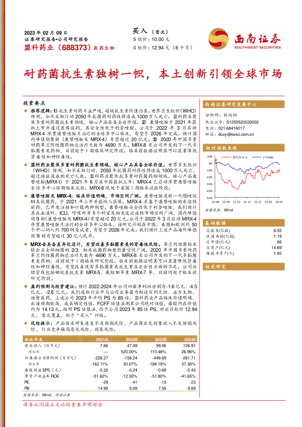 推荐逻辑:1)抗生素耐药日益严峻,超级抗生素价值凸显。世界卫生组织(WHO)预测,如不采取行动2050年抗菌药耐药性将造成1000万人死亡。盟科药业聚焦多重耐药菌抗生素领域,核心产品具备全球价值。2)康替唑胺于2021年获批上市并通过医保谈判,其安全性优于利奈唑胺。公司于2022年3月启动MRX-4序贯康替唑胺片治疗的全球多中心临床,有望于2026年完成。预计国内峰值销售额(康替唑胺及MRX-4)有望超过20亿元。3)2020年中国多重耐药革兰阴性菌药物总治疗天数为4690万天。MRX-8系公司开发的下一代多黏菌素类药物,目前处于Ⅰ期临床研究阶段。临床前数据证明其可以显著降低肾毒性和神经毒性。