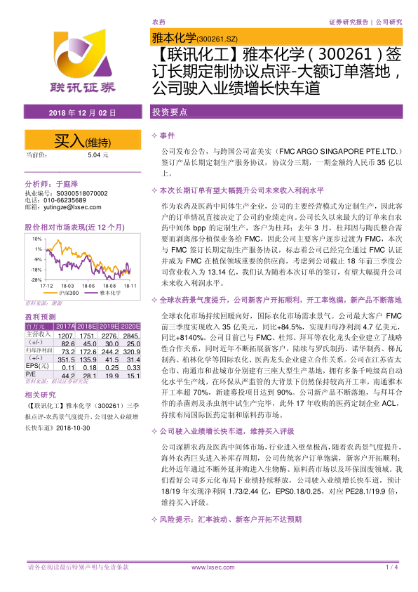 【联讯化工】雅本化学签订长期定制协议点评-大额订单落地,公司驶入业绩增长快车道