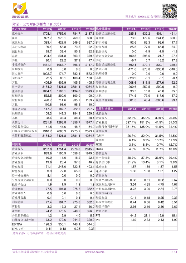 根据联讯证券研究院的盈利预测,雅本化学的财务表现预计将持续向好: