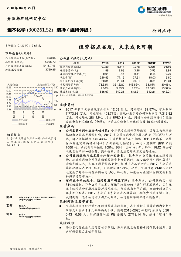 本报告分析了雅本化学2017年的业绩表现,指出公司农药中间体业务大幅增长,医药板块通过内生发展和外部并购实现增长,环保业务开始起步,期间费用率明显下降。报告预测了公司未来几年的盈利情况,维持“增持”评级,并提示了相关风险。