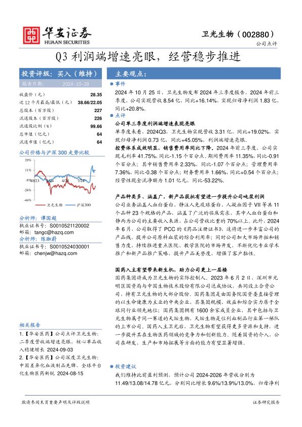 卫光生物Q3业绩表现亮眼,利润端增速显著,控费体系效果明显。公司产品线丰富,新产品获批有望提升盈利能力。国药集团入主后,有望为公司带来更多资源和支持,提升竞争力。维持“买入”评级,但需关注原料血浆供应、研发、安全及市场竞争等风险。