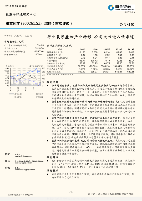国金证券首次覆盖给予公司增持评级,预计公司17-19年的EPS分别为0.11元、0.25元以及0.41元。同时,报告也提示了海外农化行业景气度复苏低于预期、海外农化巨头转移中间体低于预期以及国内环保管控力度低于预期等风险因素。