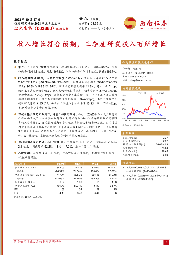 卫光生物2023年三季报显示公司业绩增长符合预期,收入和利润均实现大幅增长。公司在国际市场拓展方面取得重要进展,通过技术输出提升了市场竞争力。报告维持“买入”评级,并提示了相关风险。财务预测和估值分析为投资者提供了更全面的参考信息。
