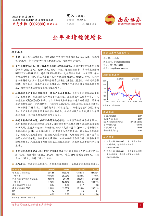 本报告分析了卫光生物2021年的业绩预告,指出公司全年业绩稳健增长,盈利能力提升,卫光生命科学园项目持续推进,血制品产品丰富且研发稳定。预计公司未来几年归母净利润将保持增长,维持“买入”评级。同时,报告也提示了市场竞争加剧、合作不及预期以及血制品放量不及预期等风险。