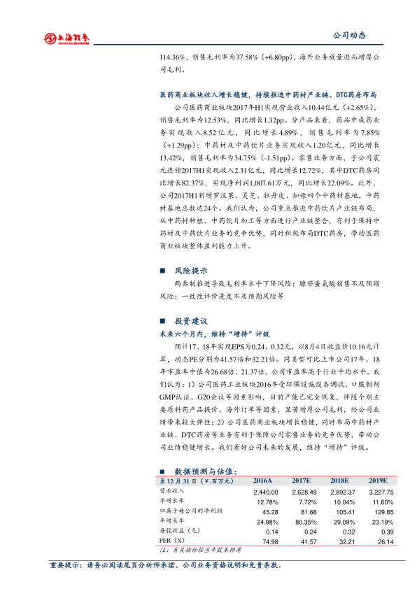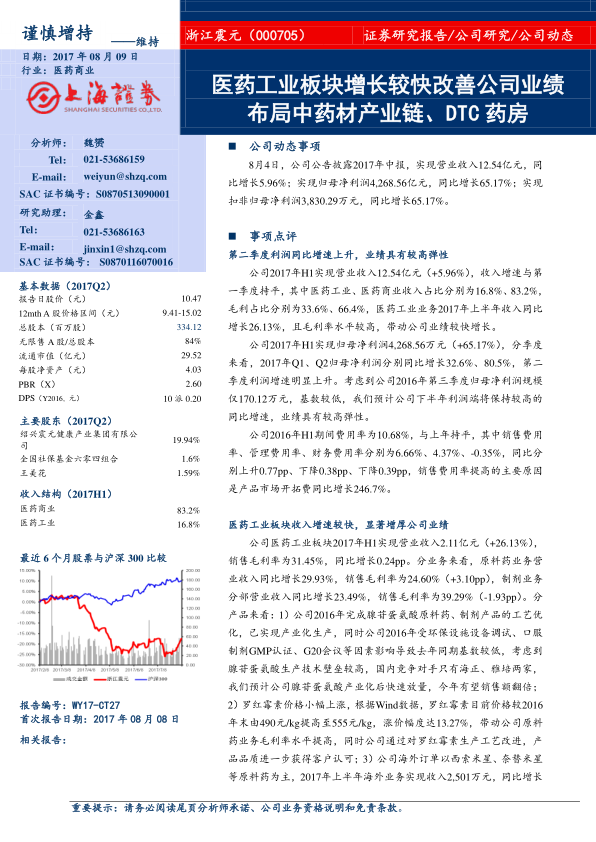 本报告分析了浙江震元2017年中报,指出公司业绩增长主要受益于医药工业板块的快速增长和医药商业板块的稳健发展。医药工业板块的腺苷蛋氨酸、罗红霉素等产品以及海外订单是主要增长驱动力。公司积极布局中药材产业链和DTC药房,有利于保障零售业务的竞争优势。报告维持“增持”评级,但同时也提示了相关风险。