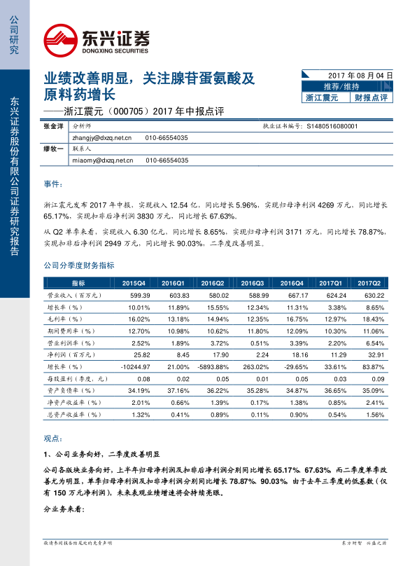 浙江震元2017年中报显示业绩显著改善,特别是二季度单季表现亮眼,归母净利润和扣非净利润大幅增长。报告强调了公司业务向好的趋势,并指出未来业绩增长的潜力。