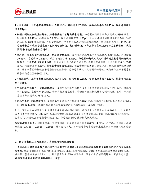 报告重点关注腺苷蛋氨酸的放量增长以及原料药业务的增长,认为这两个方面将为公司业绩带来显著的提升空间,并维持“推荐”评级。