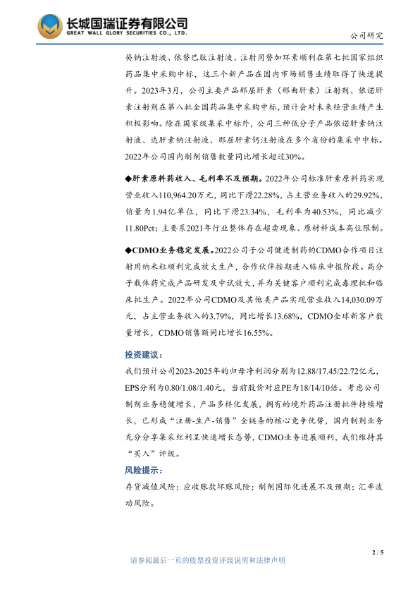 我们预计公司2023-2025年的归母净利润分别为12.88/17.45/22.72亿元,EPS分别为0.80/1.08/1.40元,当前股价对应PE为18/14/10倍。考虑公司制剂业务稳健增长,产品多样化发展,拥有的境外药品注册批件持续增长,已形成“注册-生产-销售”全链条的核心竞争优势,国内制剂业务充分分享集采红利呈快速增长态势,CDMO业务进展顺利,我们维持其“买入”评级。