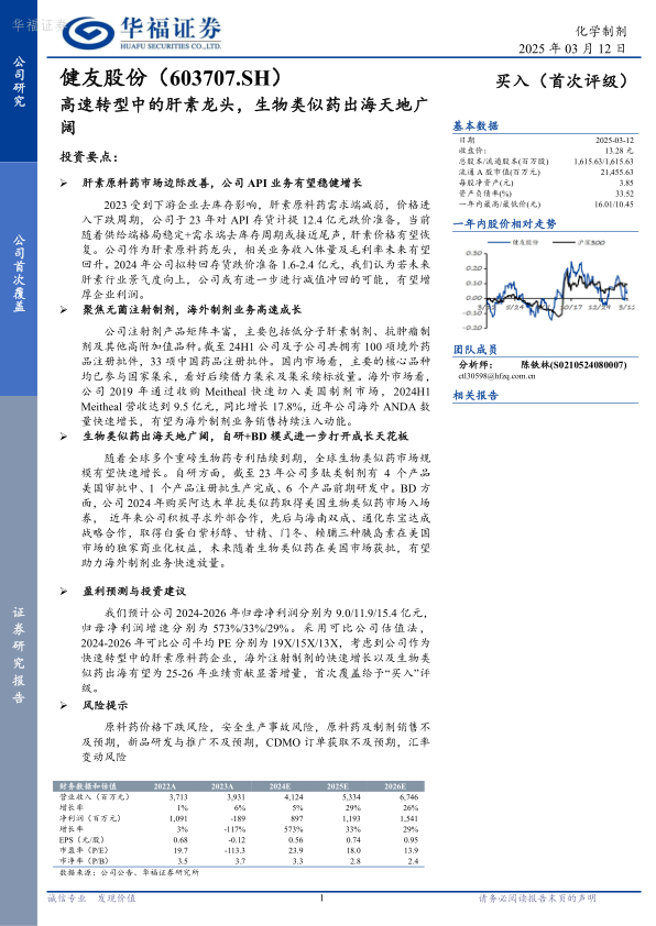 本报告分析了健友股份作为肝素原料药龙头企业,在高速转型过程中所面临的市场机遇和挑战。报告指出,随着肝素原料药市场边际改善、无菌注射制剂业务的快速发展以及生物类似药出海战略的推进,公司有望迎来业绩的持续增长。同时,报告也提示了原料药价格下跌、安全生产事故、销售不及预期等风险因素。综合来看,健友股份在海外注射制剂和生物类似药领域具备显著的增长潜力,首次覆盖给予“买入”评级。