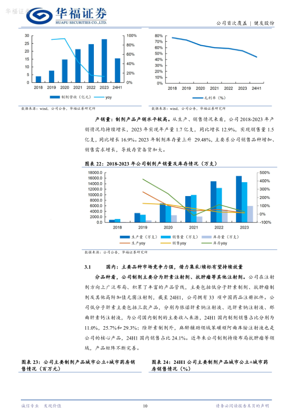 生物类似药出海天地广阔,自研+BD模式进一步打开成长天花板随着全球多个重磅生物药专利陆续到期,全球生物类似药市场规模有望快速增长。自研方面,截至23年公司多肽类制剂有4个产品美国审批中、1个产品注册批生产完成、6个产品前期研发中。BD方面,公司2024年购买阿达木单抗类似药取得美国生物类似药市场入场券,近年来公司积极寻求外部合作,先后与海南双成、通化东宝达成战略合作,取得白蛋白紫杉醇、甘精、门冬、赖脯三种胰岛素在美国市场的独家商业化权益,未来随着生物类似药在美国市场获批,有望助力海外制剂业务快速放量。
