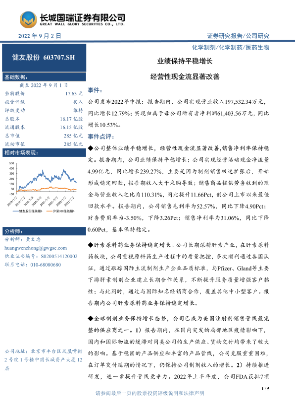 健友股份2022年中报显示,公司业绩保持平稳增长,经营性现金流显著改善。肝素原料药业务保持稳定增长,全球制剂业务和国内制剂业务均呈现良好增长态势,生物创新药项目投产。维持“买入”评级,看好公司未来发展。