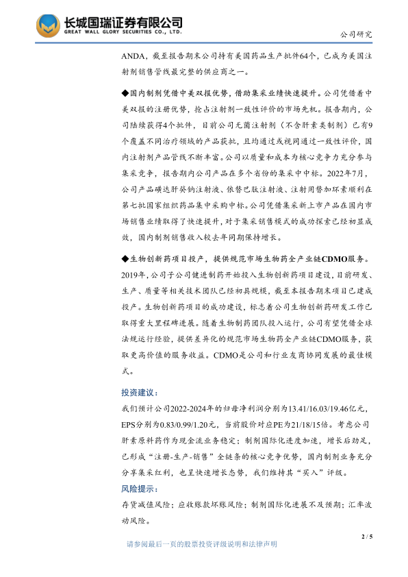我们预计公司2022-2024年的归母净利润分别为13.41/16.03/19.46亿元,EPS分别为0.83/0.99/1.20元,当前股价对应PE为21/18/15倍。考虑公司肝素原料药作为现金流业务稳定;制剂国际化进度加速,增长后劲足,已形成“注册-生产-销售”全链条的核心竞争优势,国内制剂业务充分分享集采红利,也呈快速增长态势,我们维持其“买入”评级。