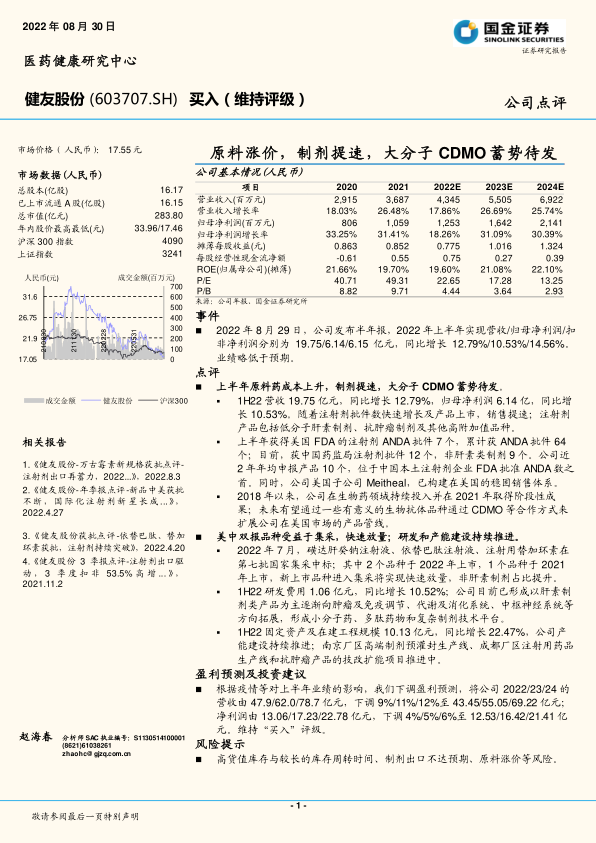 健友股份在2022年上半年虽受原料药成本上升影响,业绩增速略低于预期,但其核心业务展现出强劲的增长潜力和战略韧性。公司通过加速高附加值注射剂的研发与国际化布局,积极拓展大分子CDMO业务,并有效利用国家集采政策实现新品快速放量,正逐步优化产品结构,提升盈利能力。持续的研发投入和产能扩张为公司未来发展奠定了坚实基础。尽管盈利预测有所下调,但报告维持“买入”评级,表明市场对健友股份在医药健康领域的长期增长前景,尤其是在国际化和创新药械领域的战略布局充满信心。投资者需关注高货值库存、出口不达预期及原料涨价等潜在风险。