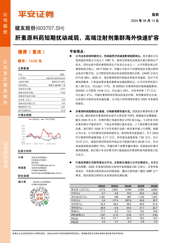 健友股份正处于业务结构深度优化和全球化扩张的关键阶段。尽管2023年受肝素原料药价格波动及存货减值等因素影响,公司业绩短期承压,但其核心业务已成功转向高附加值的制剂领域。随着肝素原料药市场进入新的上行周期,以及公司在海外高端注射剂市场的持续扩容和生物药领域的战略布局,健友股份的盈利能力和长期成长空间有望显著提升。报告预计公司2024-2026年营收将分别达到43.44/53.22/66.24亿元,净利润分别为8.67/11.53/15.07亿元。鉴于公司海外生物药业务的持续拓展及其价值提升潜力,首次覆盖给予“推荐”评级,目标价15.37元。