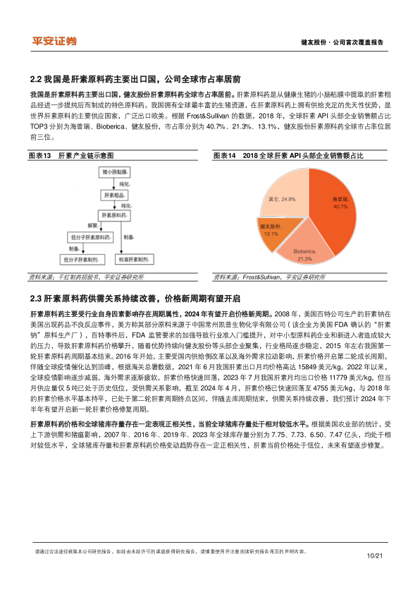 风险提示:1)原料药价格波动影响:肝素原料药价格受供需关系影响波动,影响公司盈利水平。2)海外制剂放量不及预期:公司海外制剂产品上市后各个节点是否顺利推进对于公司产品销售放量具有显著影响。3)国家政策的影响:医保谈判政策可能调整,从而影响公司国内制剂销售。