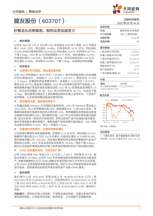 本报告对健友股份(603707)2021年年报及2022年一季报进行了分析,核心观点如下: