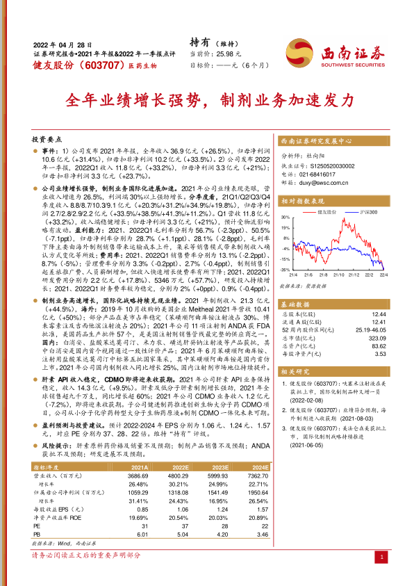 肝素 API 收入稳定,CDMO即将迎来收获期。2021 年公司肝素 API 业务保持稳定,收入 14.3 亿元(+9.5%)。肝素及低分子肝素制剂增长强劲,2021 年全球销售超九千万支,同比增长超 60%;2021 年公司 CDMO 业务收入 1.2 亿元(-7.2%),即将迎来收获期。子公司健进制药推进创新生物大分子药 CDMO项目,公司从小分子化学药转型大分子生物药原液+制剂 CDMO一体化未来可期。