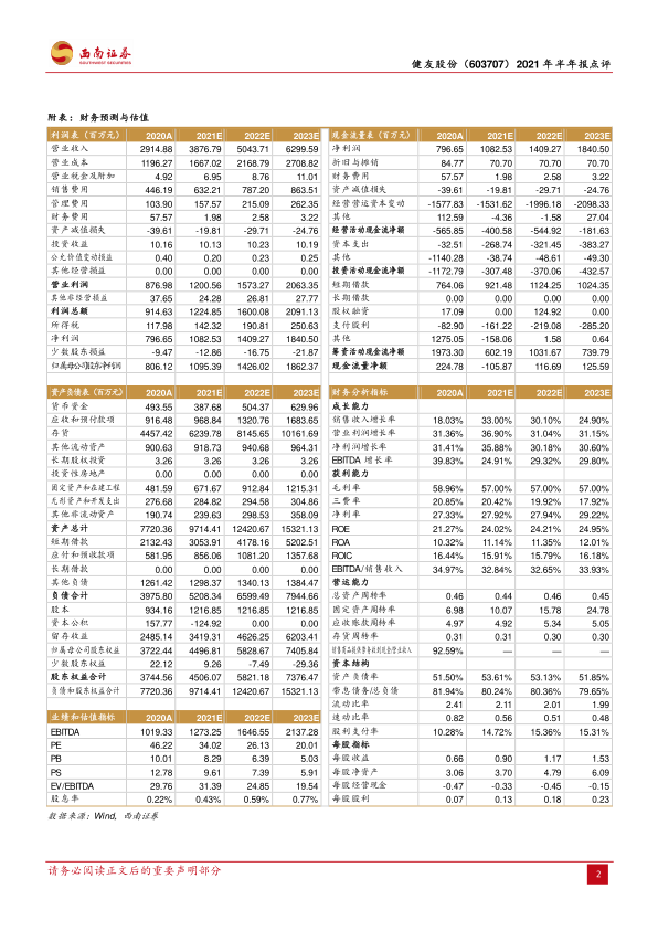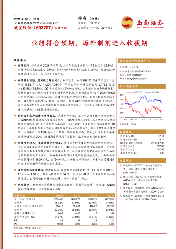 本报告对健友股份(603707)2021年半年报进行了深度分析,核心观点如下: