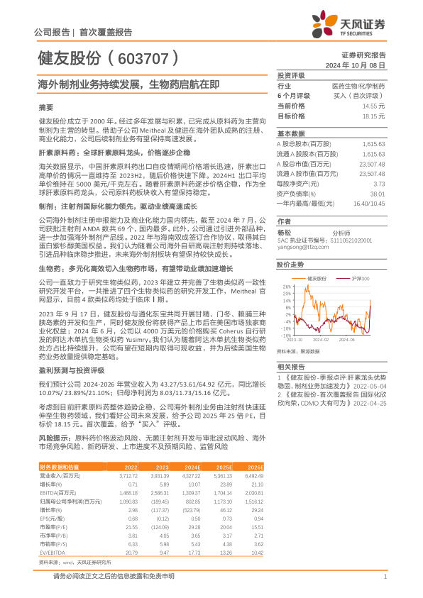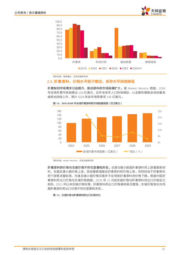考虑到目前肝素原料药整体趋势企稳,公司海外制剂业务由注射剂快速延伸至生物药领域,我们看好公司未来发展,给予公司2025年25倍PE,目标价18.15元。首次覆盖,给予“买入”评级。